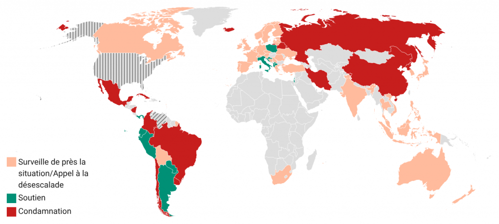 Treize pays ont condamné l’attaque américaine et la capture de Maduro dont le Bélarus, le Brésil, le Mexique, le Chili, Cuba, la Colombie, qui a annoncé le déploiement de troupes à la frontière avec le Venezuela ; l’Iran, qui fait face à des contestations massives et que Donald Trump a mis en garde le 2 janvier, d’intervenir si le régime réprime les manifestations ; la Chine et la Russie.