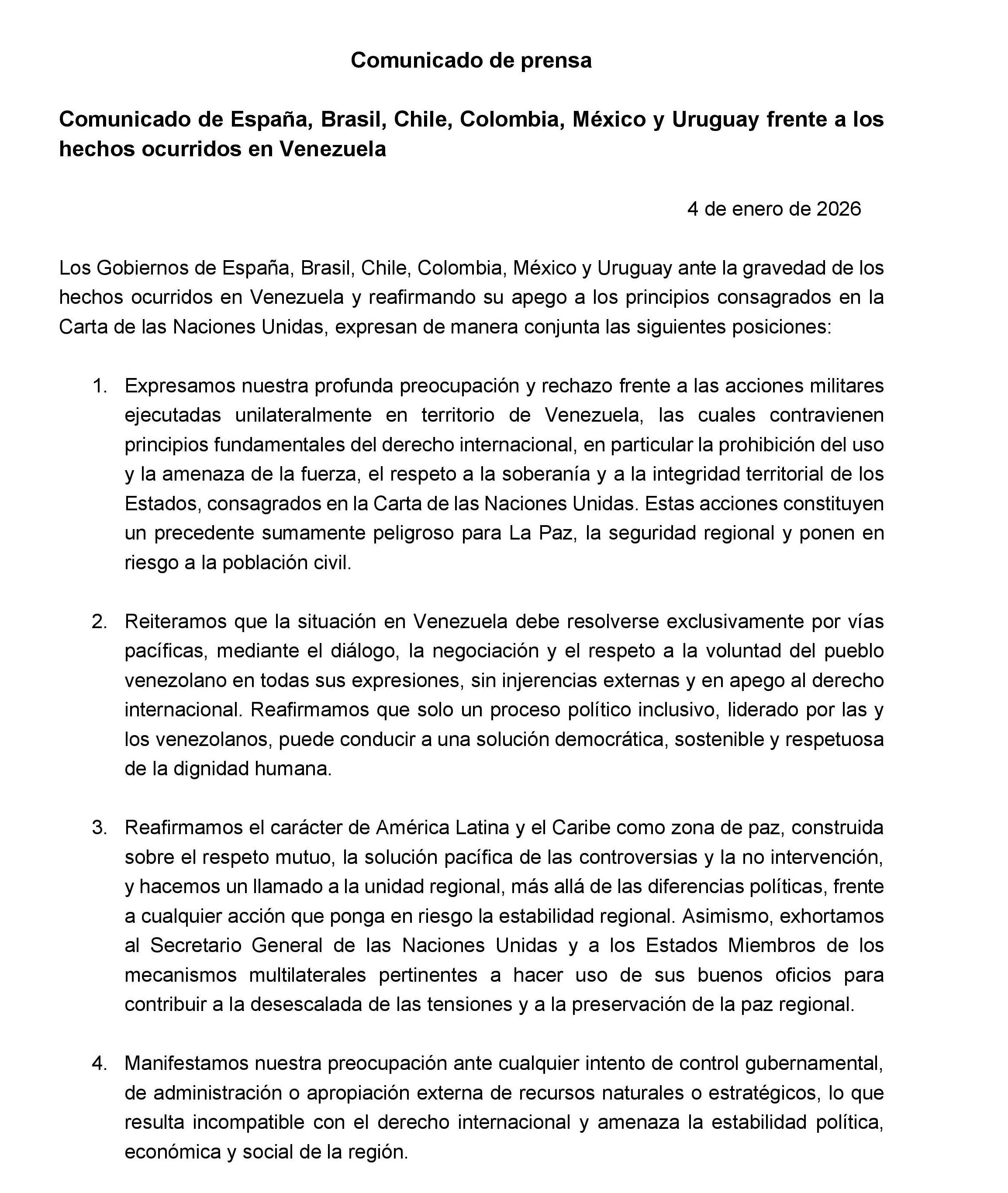 L’Espagne, le Brésil, le Chili, la Colombie, le Mexique et l’Uruguay ont publié une déclaration commune rejetant les opérations militaires unilatérales. Les gouvernements décrivent ces actions comme des violations du droit international et mettent en garde contre les risques pour la paix régionale.