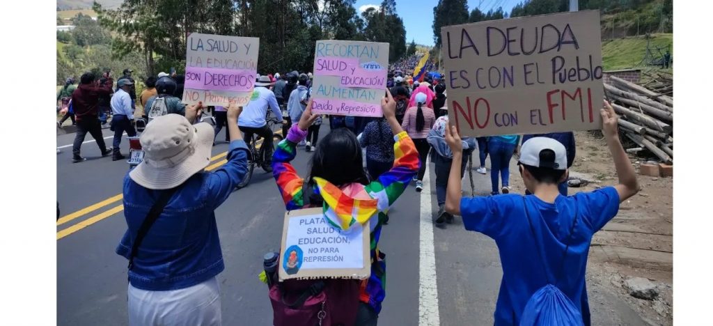 Quelques semaines auparavant, à l’initiative du FUT (Front unitaire des travailleurs), une vingtaine d’organisations avaient formé le Front pour la défense de la santé, de l’éducation publique, du travail décent, de la sécurité sociale, des droits humains et de la nature. Le FUT et ce nouveau Front ont organisé plusieurs actions, manifestations et sit-in pour protester contre les lois antidémocratiques sur l’intégrité, la sécurité et le renseignement (qui instaurent une sorte d’état d’urgence permanent et étendent les possibilités d’espionnage contre les organisations et les dirigeants sociaux), contre un projet de réforme de la loi sur la sécurité sociale qui ouvrira la porte aux banques privées pour contrôler certaines parties de la BIESS (la banque de l’Institut équatorien de sécurité sociale), contre les milliers de licenciements dans le secteur public (on estime que le gouvernement licenciera 70 000 travailleur·ses) et contre la crise que l’inaction du gouvernement a provoquée dans le domaine de la santé publique.