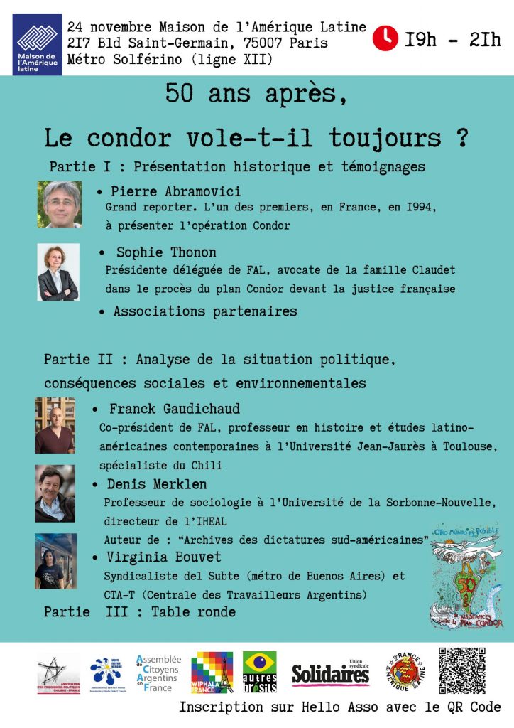 Pour clore notre campagne « Les 50 ans du plan Condor », un colloque organisé par France Amérique Latine, Autres Brésils, Association des Ex-Prisonniers Politiques chiliens en France, ACAF – Association des Citoyens argentins en France, ¿Dónde están?, Wiphala France, Union syndicale Solidaires aura lieu le 24 novembre 2025 à la Maison de l’Amérique Latine.