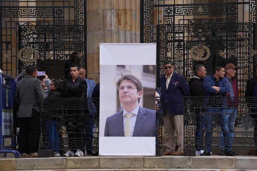 Des Colombiens rendent hommage à Miguel Uribe devant le Congrès à Bogotá, le 12 août 2025 au lendemain du décès de l’homme politique des suites de ses blessures. Juancho Torres / Anadolu / AFP