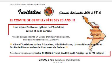 Posted on 21 novembre 201114 janvier 2016 by webmaster1 Comité France Amérique Latine Gentilly-Samedi 3 décembre Soirée des 20 ans TELECHARGER L’INVITATION Partager la publication "Comité France Amérique Latine Gentilly-Samedi 3 décembre Soirée des 20 ans" FacebookXPartager...