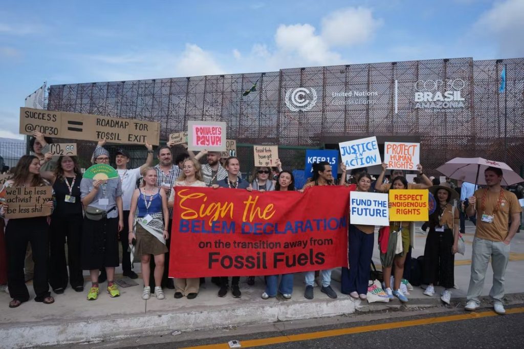 Manifestation pour la sortie des énergies fossiles devant la COP30, à Belem (Brésil), le 19 novembre 2025. André Penner / AP
