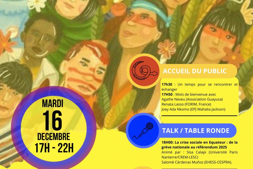 À l’occasion de la soirée de partage, d’analyse et de soutien au peuple équatorien, organisée avec l’appui de France Amérique Latine le 16 décembre 2025 à l’Espace Jeunes Mahalia Jackson, à Paris, l’équipe d’Actualités des luttes a pu enregistrer les prises de parole de Salomé Cardenas Munoz et de Sisa Calapi sur la situation sociale et politique en Équateur.