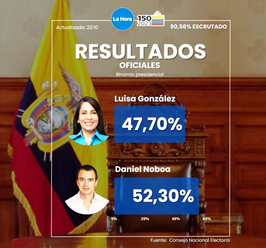 Les derniers résultats disponibles portent sur 94,03 % des suffrages exprimés et donnent M. Noboa vainqueur avec 52,3 % des voix. Son adversaire, la candidate socialiste Luisa González, dauphine de l’ex-président Rafael Correa (2007-2017), recueillerait 47,7 % des votes. Elle a reconnu sa défaite et félicité son rival.