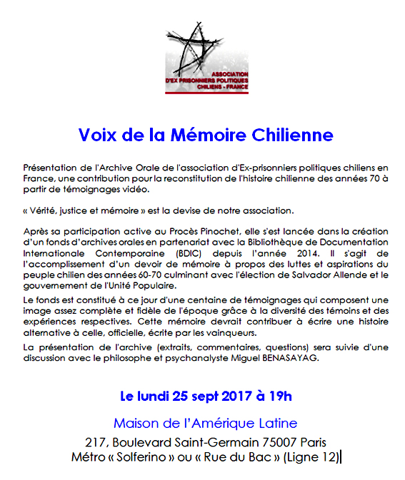 Le 25 septembre 2017-Maison de l’Amérique Latine: Voix de la mémoire chilienne
