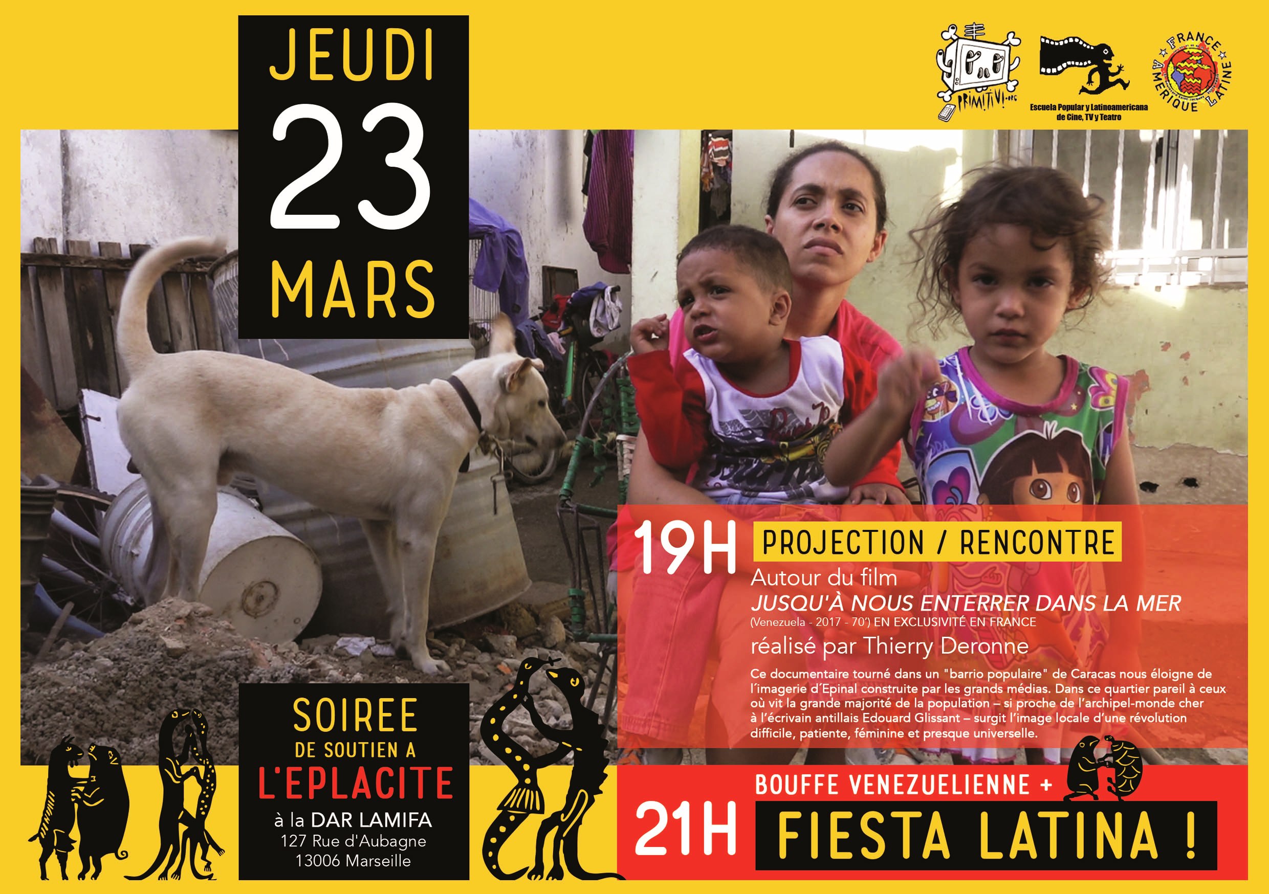 Jeudi 23 mars 19h Dar Lamifa, 127 rue d’Aubagne, Marseille. Soirée de soutien à l’EPLACITE organisée par Primitivi avec la collaboration de FAL Marseille. Projection (en exclusivité) de « Jusqu’à nous enterrer dans la mer » (2017), film consacré à un « barrio » populaire de Caracas d’ou surgit une révolution difficile, patiente, féminine et presque universelle. Repas et fiesta latina avec plusieurs groupes musicaux.