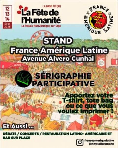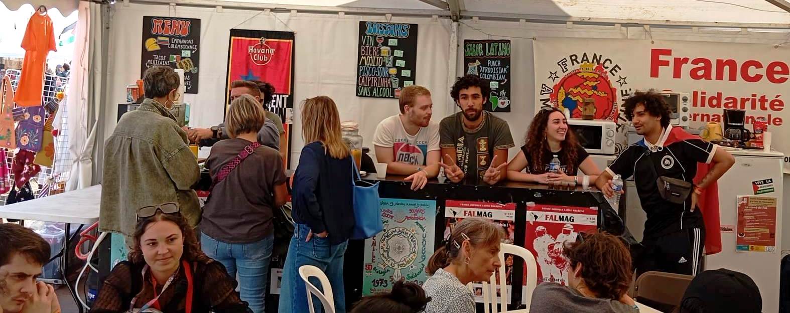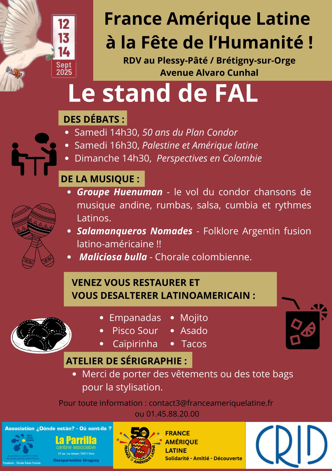 Les 12, 13 et 14 septembre 2025, comme chaque année, FAL était présente à la Fête de l’Humanité, évènement politique majeur de la rentrée. Proposant des débats, concerts, vente d’artisanat, exposition de photos sur la Colombie, atelier de sérigraphie ainsi que de la restauration et des boissons latino-américaines, le stand de FAL, partagé avec l’association ¿Dónde Están ? Uruguay – France, a connu un grand succès lors de ces trois jours intenses en échanges et en rencontres, la Fête affichant complet dès le samedi après-midi.