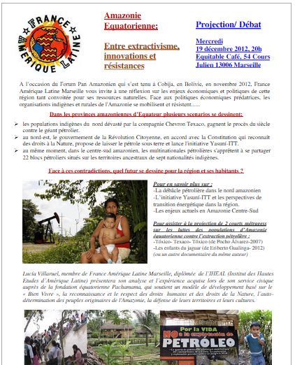 Posted on 12 décembre 201214 janvier 2016 by webmaster1 FAL Marseille : Projection débat le 19 décembre : Amazonie équatorienne : entre extractivisme, innovations et résistances Projection débat Partager la publication "FAL Marseille : Projection débat le 19 décembre : Amazonie équatorienne : entre extractivisme, innovations et résistances" FacebookXPartager...