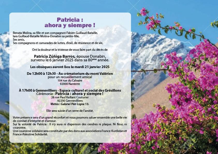 C’est avec une très grande tristesse que France Amérique Latine annonce la disparition soudaine, le 6 janvier 2025, de Patricia Zuñiga Barros, notre amie, camarade et présidente de FAL Gennevilliers.