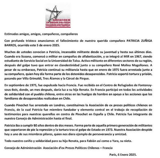 Nous partageons la peine de nos ami·es de l’association des Ex-Prisonniers Politiques chiliens, dont elle était une des fondatrices au regard de son rôle dans la résistance à la dictature de Pinochet comme militante du MIR. Elle fut emprisonnée et torturée malgré sa grossesse notamment à la Villa Grimaldi. Son mari, René Molina, fait partie des détenus disparus.