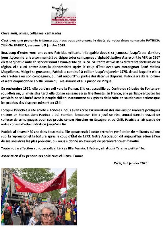 Nous partageons la peine de nos ami·es de l’association des Ex-Prisonniers Politiques chiliens, dont elle était une des fondatrices au regard de son rôle dans la résistance à la dictature de Pinochet comme militante du MIR. Elle fut emprisonnée et torturée malgré sa grossesse notamment à la Villa Grimaldi. Son mari, René Molina, fait partie des détenus disparus.