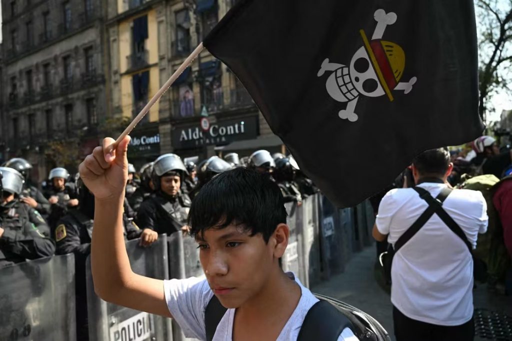À quelques mètres d’un vendeur à la sauvette qui offre des drapeaux pirates du manga japonais One Piece pour l’équivalent de 1,50 euro, Emanuel Montecristo, un ouvrier du bâtiment de 28 ans, exige du mur de policiers devant lui de laisser passer la petite centaine de manifestants réunie ce jeudi 20 novembre, à Mexico, pour dénoncer la corruption et l’insécurité.