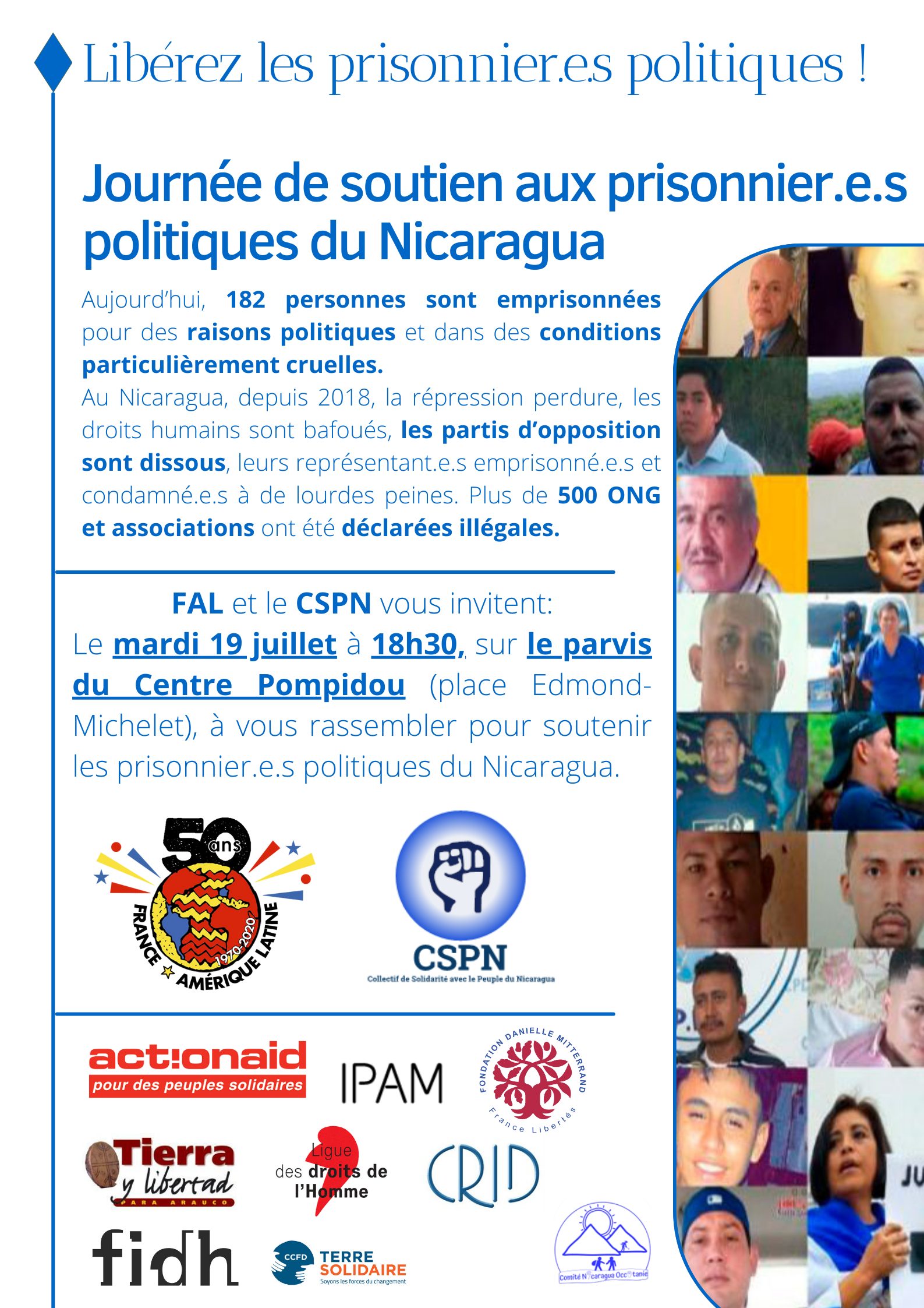 France Amérique Latine et le Collectif de Solidarité avec le peuple du Nicaragua organisent une journée de soutien aux prisonniers politiques le 19 juillet à 18h30 sur le parvis du Centre Pompidou!
