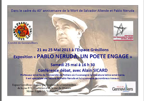 21 au 25 Mai 2013 à l’Espace Grésillons Exposition « PABLO NERUDA, UN POETE ENGAGE » Samedi 25 mai à 16 h 30 Conférence débat, avec Alain SICARD Professeur émérite de l’Université (…)