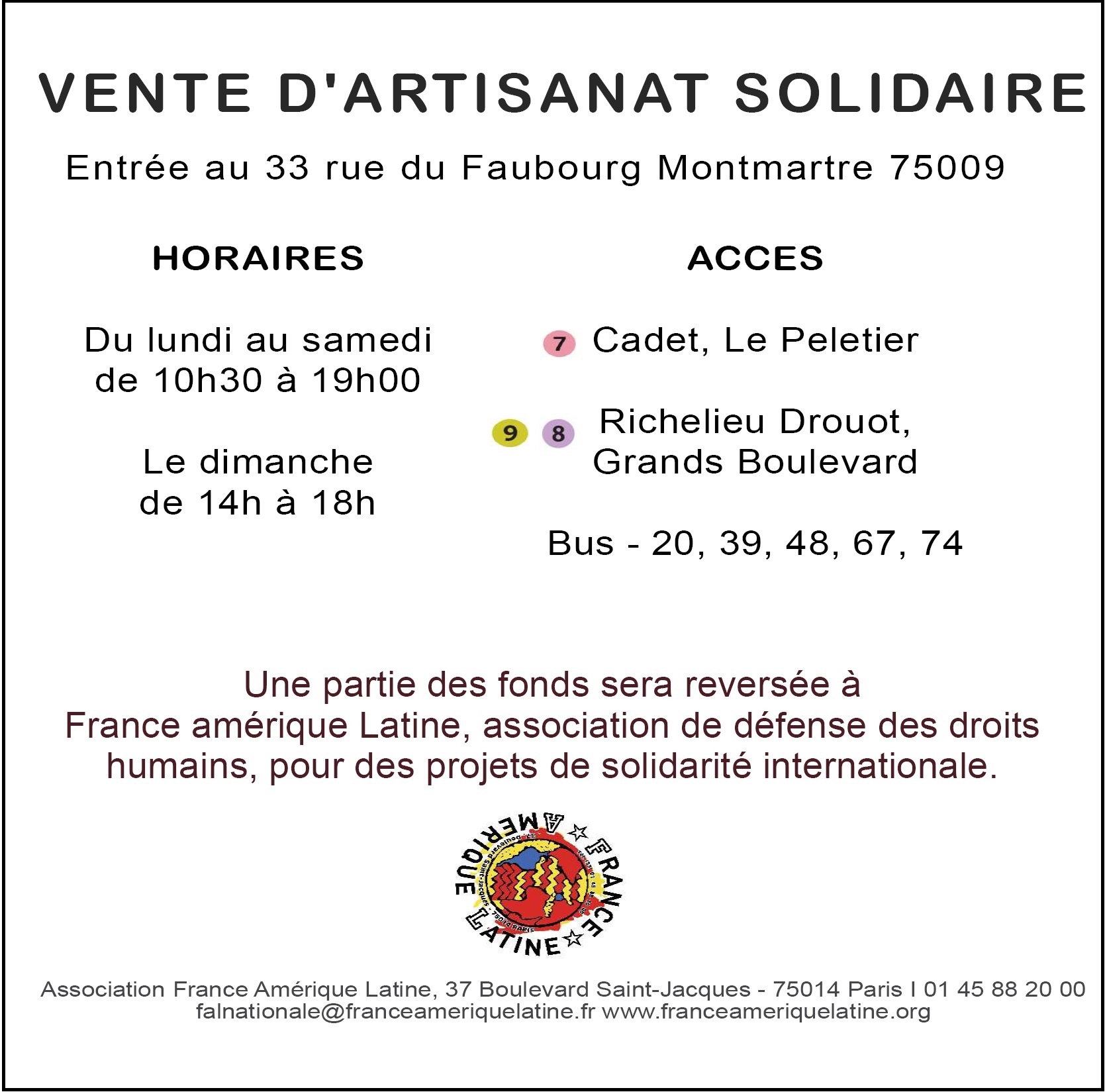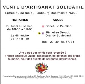Du 28 novembre au 29 décembre inclus, retrouvez-nous pour notre traditionnelle vente d’artisanat au 15-17 Passage Verdeau, dans le 9ème arrondissement à Paris (Entrée au 33 rue du Faubourg Montmartre), du lundi au samedi de 10h30 à 19h, et le dimanche de 14h à 18h.