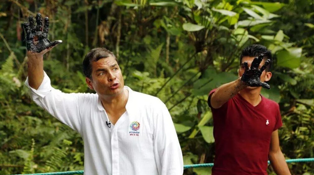 Le 17 septembre 2013, le président équatorien Rafael Correa se rend sur un site pollué par le pétrole de Texaco, en pleine forêt tropicale amazonienne. AP – Dolores Ochoa