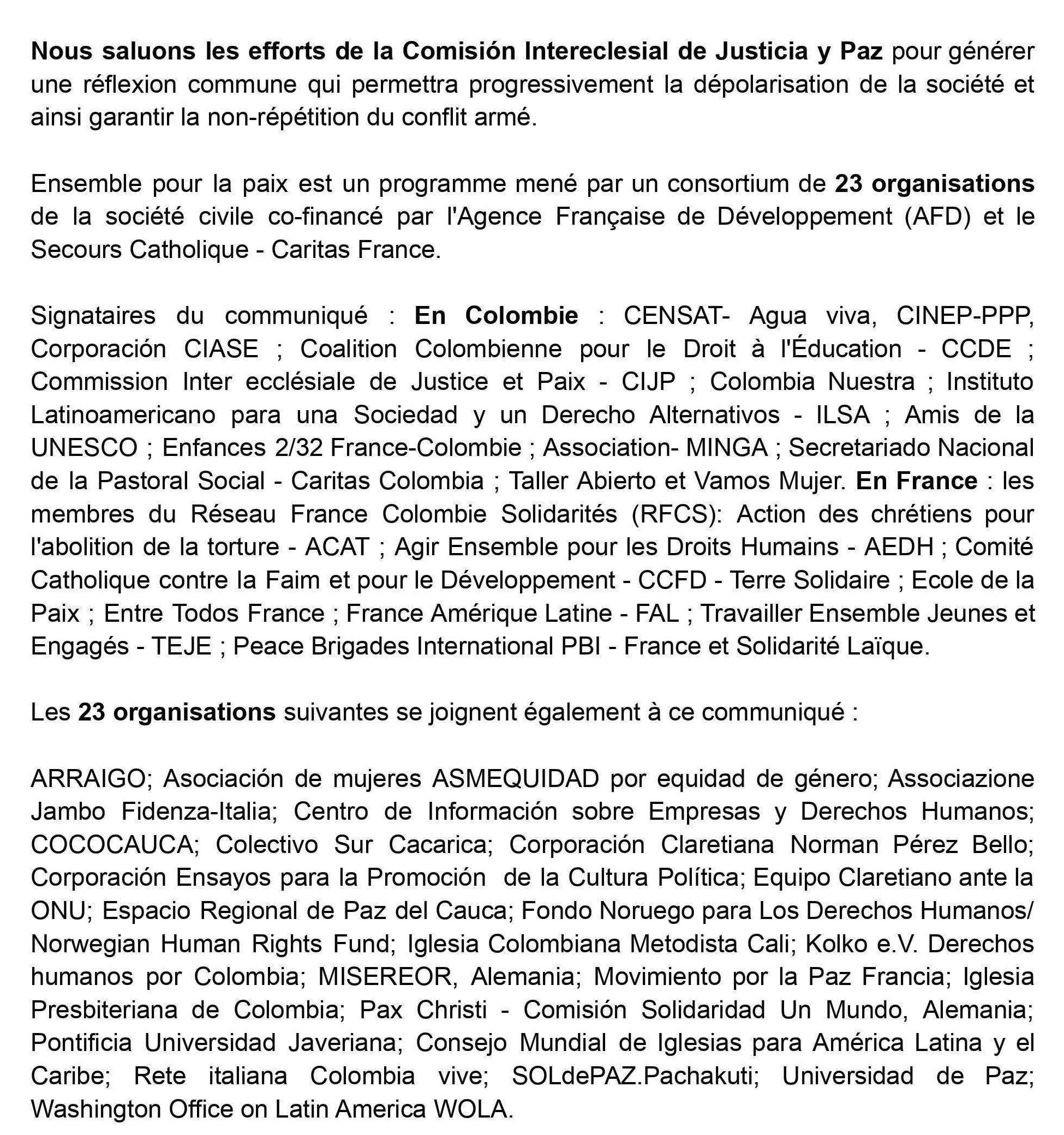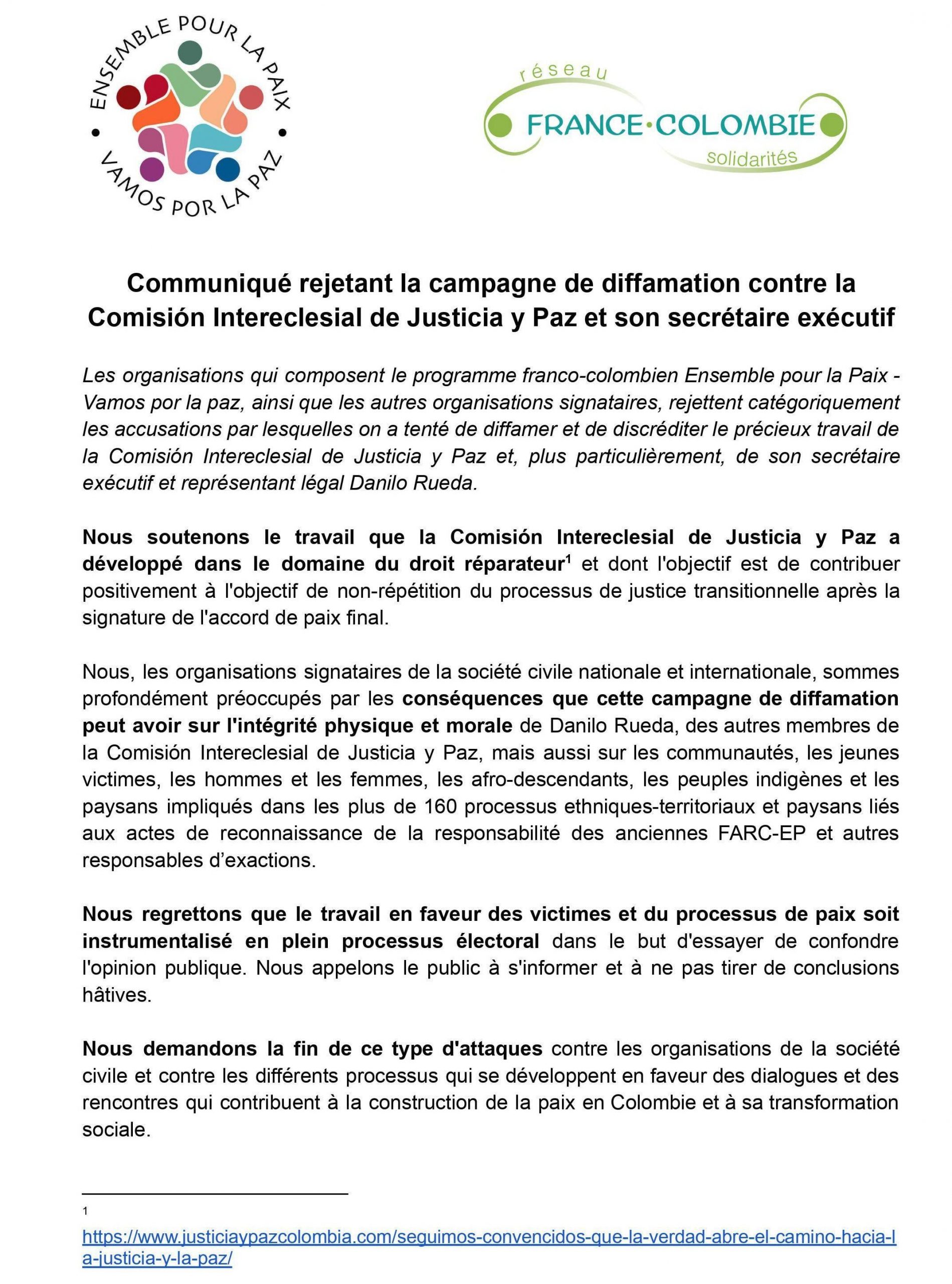 Vamos por la paz – Ensemble pour la paix en Colombie / France Colombie : communiqué rejetant la campagne de diffamation contre la Comisión Intereclesial de Justicia y Paz